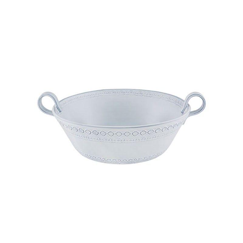 Ensaladera baja de loza en blanco envejecido, ideal para servir ensaladas, frutas o guarniciones con estilo. Con asas laterales para un manejo cómodo y detalles decorativos en el borde, combina elegancia y funcionalidad. Perfecta para mesas de comedor o eventos especiales. Dimensiones: 37 x 29,3 x 12,3 cm.