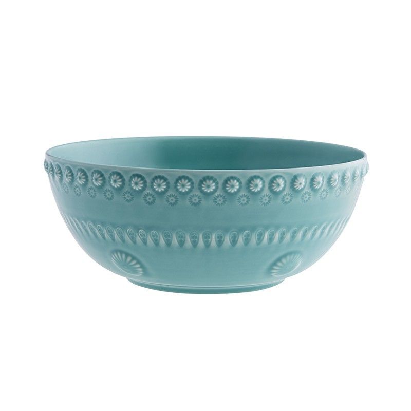 Ensaladera grande de loza en color turquesa, ideal para servir ensaladas, frutas o guarniciones con estilo. Con acabado decorativo en relieve que combina motivos florales y conchas, aporta un toque elegante a tu mesa. Resistente y fácil de limpiar, perfecta para uso diario o ocasiones especiales. Dimensiones: 30,7 x 30,7 x 10,3 cm.