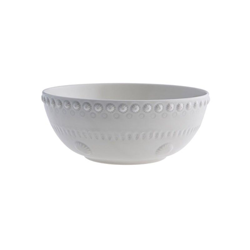 Ensaladera pequeña de loza en blanco, ideal para servir ensaladas, frutas o guarniciones con estilo. Con diseño decorativo de puntos y motivos circulares en relieve, aporta un toque elegante a tu mesa. Fabricada en loza de calidad, resistente y fácil de limpiar. Perfecta para uso diario o ocasiones especiales.