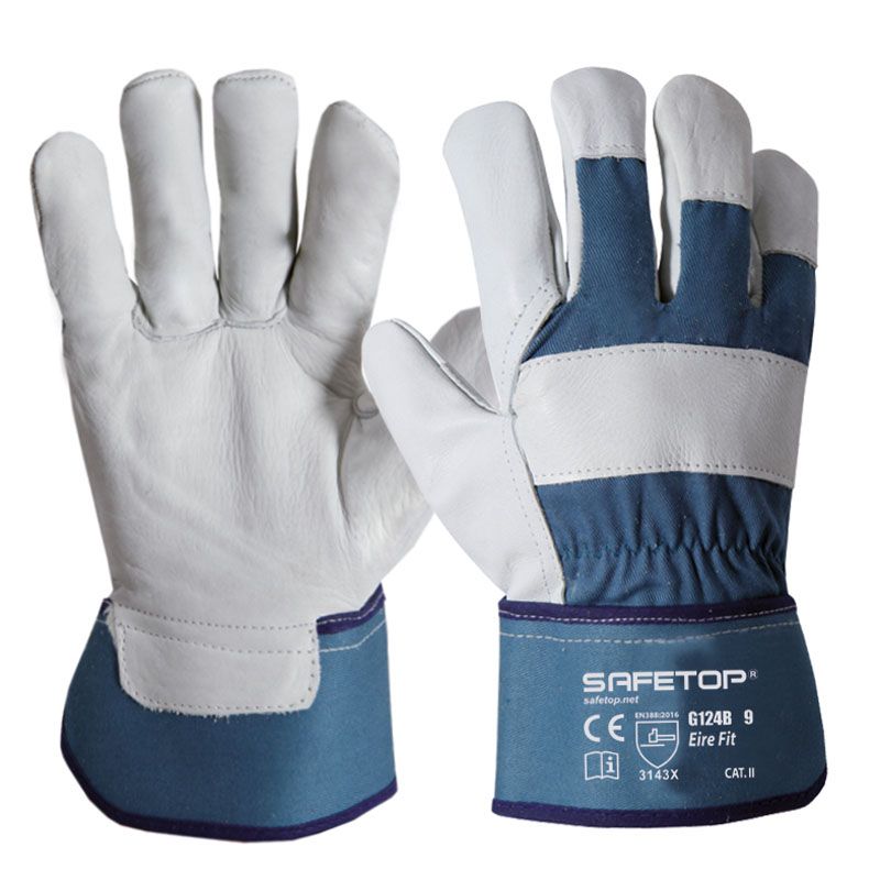 Guante de seguridad Erie Fit, ideal para trabajos industriales y manuales. Confeccionado con piel flor vacuno en la punta y lona de algodón en palma y muñequera, ofrece resistencia y comodidad. Diseño colorblock en blanco y azul con ajuste ergonómico en muñeca. Talla 9, perfecto para adultos que necesitan protección y agarre seguro.