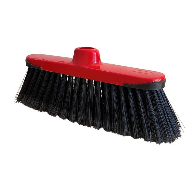 Escoba Toscana sin palo, ideal para limpiar suelos de casa y jardín. Con cabezal de plástico rojo y cerdas sintéticas negras resistentes, ofrece una limpieza eficaz y duradera. Fácil de montar con cualquier mango estándar. Perfecta para uso diario en hogares y espacios exteriores.