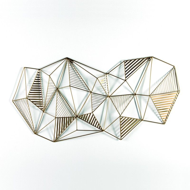Escultura de pared de metal dorado con diseño geométrico moderno, ideal para decorar espacios con estilo contemporáneo. Con dimensiones de 128x5x64 cm, su estructura tridimensional de triángulos interconectados y detalles en negro aporta profundidad visual. Perfecta para salones, pasillos o oficinas que buscan un toque artístico y sofisticado.