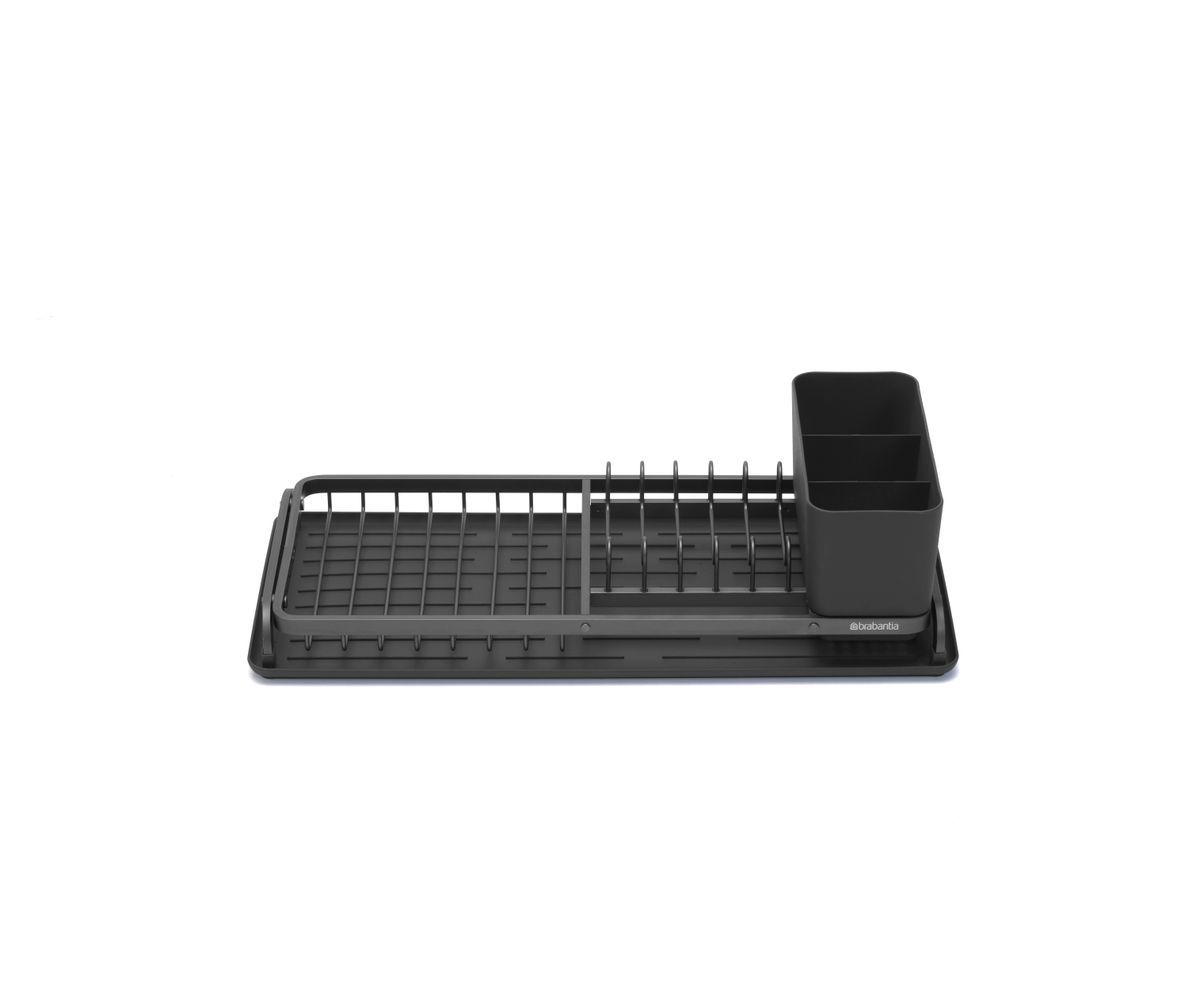 Escurreplatos compacto Brabantia en gris oscuro, fabricado en plástico resistente y con rejilla metálica para un secado eficiente. Ideal para cocinas modernas, incluye compartimento para cubiertos y diseño ergonómico que ahorra espacio. Perfecto para mantener la encimera ordenada y seca.
