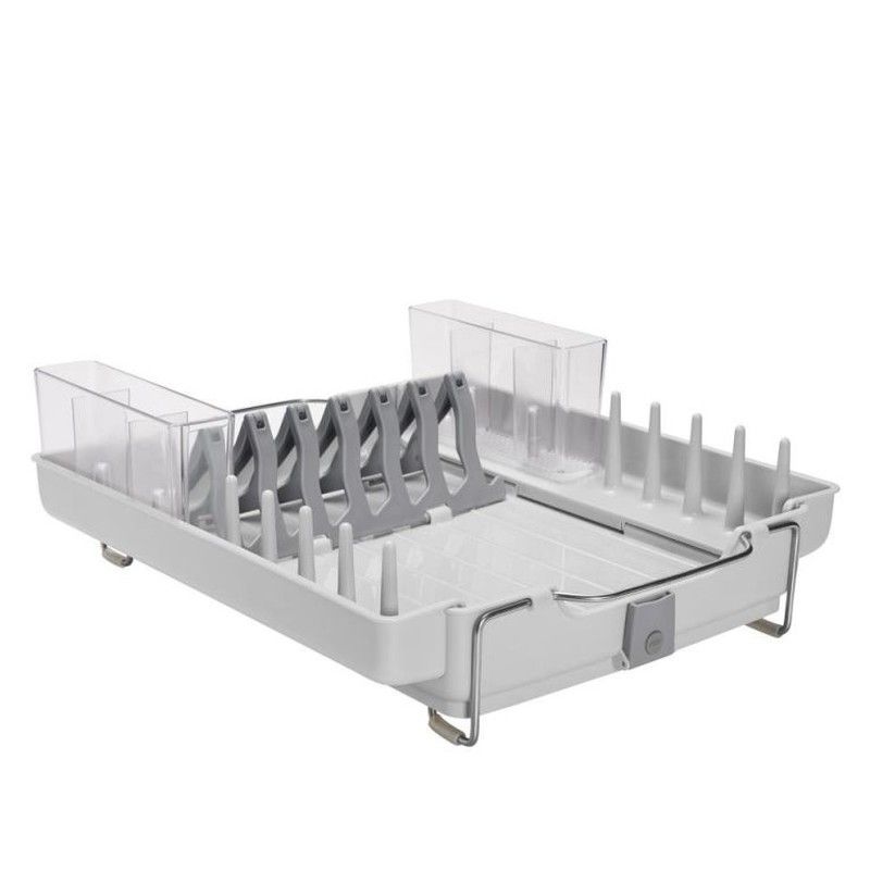 Escurreplatos plegable OXO de diseño moderno y funcional, ideal para cocinas pequeñas o espacios reducidos. Fabricado en plástico resistente y acero inoxidable, cuenta con compartimentos para cubiertos y vasos, y soportes para platos. Fácil de plegar y almacenar, perfecto para mantener la cocina ordenada y seca tras el lavado.