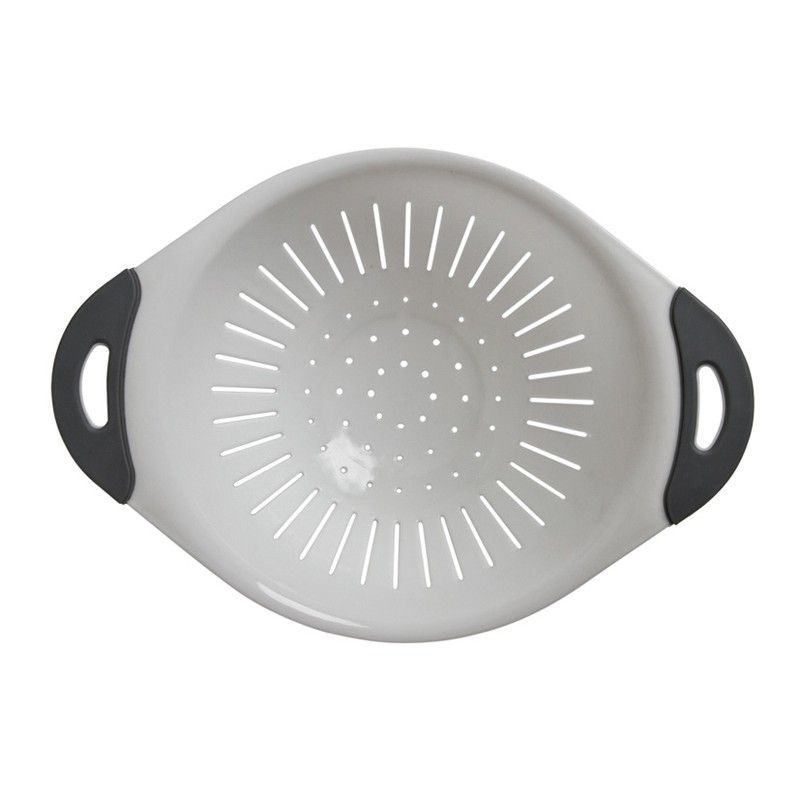 Escurridor de cocina de plástico con diseño ovalado y perforaciones radiales para un escurrido eficiente. Con manijas negras ergonómicas, es ideal para colar pasta, verduras o frutas. Resistente y fácil de limpiar, perfecto para uso diario en cualquier hogar.