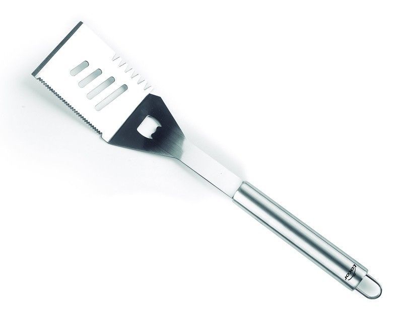 Espátula para barbacoa Lacor en acero inoxidable, ideal para cocinar al aire libre. Su mango largo y resistente permite un manejo seguro, mientras que las ranuras en la hoja facilitan el drenaje de grasas. Diseño robusto y duradero, perfecto para amantes de la cocina al fuego.