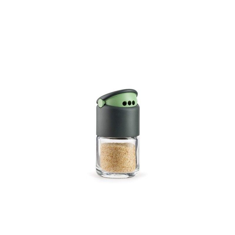 Especiero Diseño Lkeue con cuerpo de vidrio transparente y tapa de plástico en tonos verde y negro. Ideal para espolvorear especias con precisión en la cocina. Su diseño moderno y funcional lo hace perfecto para cualquier hogar. Fácil de usar y limpiar, ideal para mantener tus condimentos organizados y a mano.