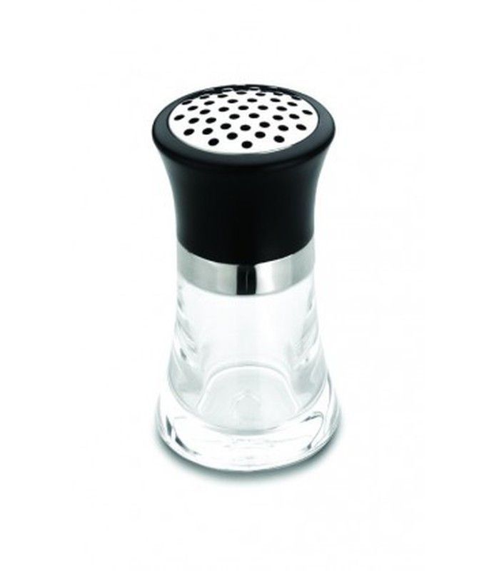 Especiero para queso rayado de 7 cm con cuerpo de vidrio transparente y tapón negro con perforaciones precisas. Ideal para espolvorear queso rallado sobre pastas, ensaladas o platos calientes. Diseño elegante y funcional, con anillo de acero inoxidable que asegura la unión. Perfecto para cocinas modernas y uso diario en el comedor.