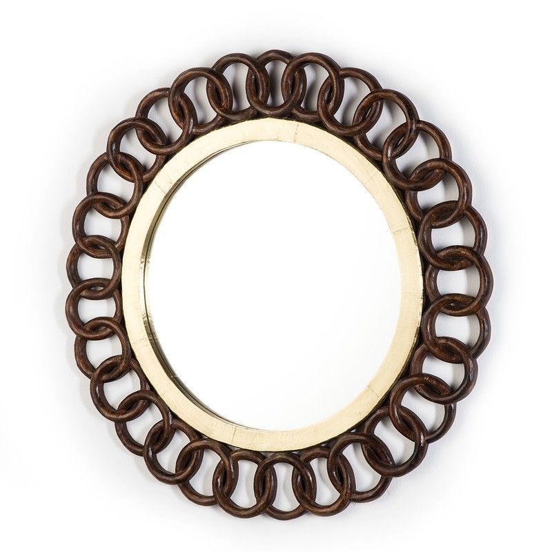 Espejo circular de 91 cm de diámetro con marco de anillos entrelazados en madera marrón y borde dorado de estaño. Ideal para decorar salones, pasillos o dormitorios con un toque sofisticado y elegante. Fabricado con cristal de calidad, combina estilo clásico con diseño moderno. Perfecto para espacios que buscan un punto focal decorativo.