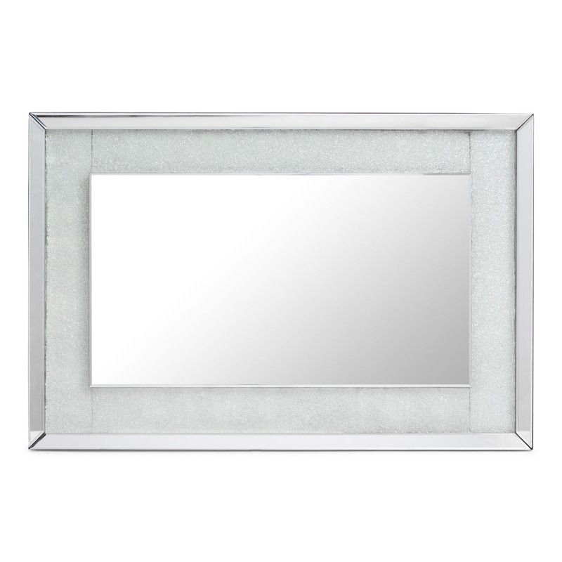Espejo de pared rectangular de 60x90 cm con marco de madera en acabado plateado brillante y borde interior texturizado. Ideal para decorar salones, dormitorios o entradas. Diseño moderno y sofisticado que aporta luz y amplitud a cualquier espacio. Fácil instalación y mantenimiento.