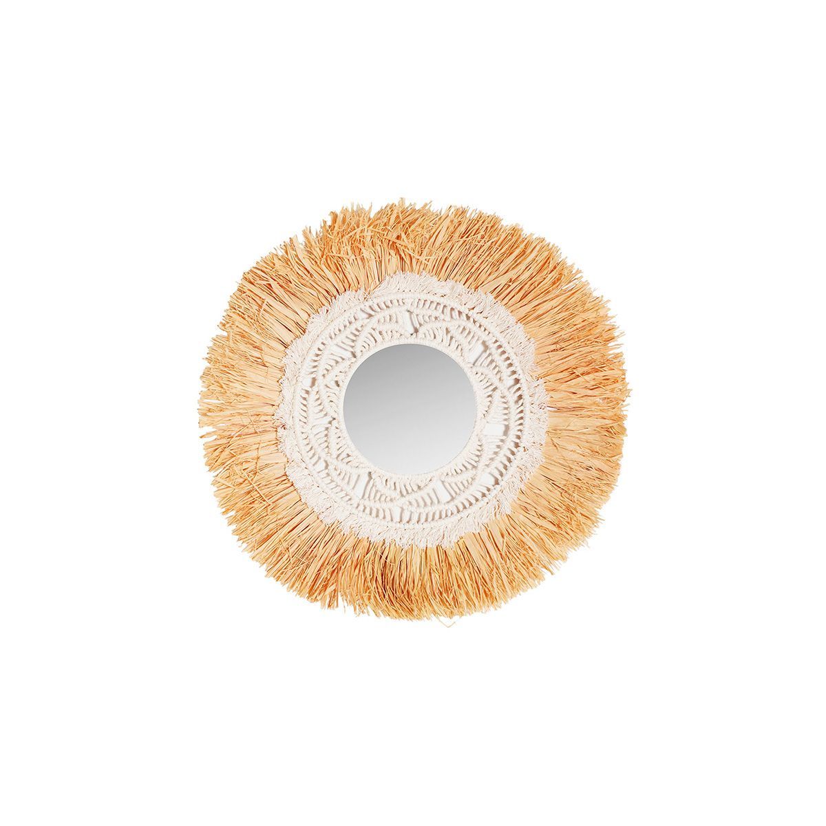 Espejo decorativo circular de 43 cm con marco de rafia marrón y detalles tejidos en blanco. Ideal para espacios con estilo bohemio, rústico o escandinavo. Aporta calidez y textura a paredes de salones, dormitorios o entradas. Fácil de colgar y perfecto como pieza central de decoración.