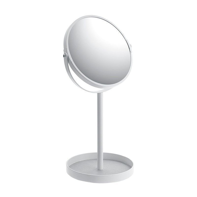 Espejo tocador de diseño minimalista en blanco, fabricado en acero inoxidable. Ideal para maquillaje y cuidado personal, con base estable y espejo giratorio para una visión óptima. Perfecto para tocadores, mesitas de noche o baños. Estilo elegante y funcional para cualquier hogar.