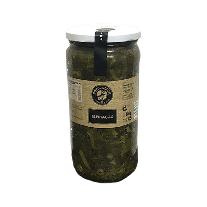 Espinacas en conserva Botularium, presentadas en un bote de vidrio transparente con tapa blanca y etiqueta de cartón marrón. Ideal para cocinar platos saludables y rápidos, estas espinacas envasadas mantienen su textura y sabor natural. Perfectas para añadir a sopas, guisos o como acompañamiento. Contenido neto: 650g. Conserva de calidad para uso d
