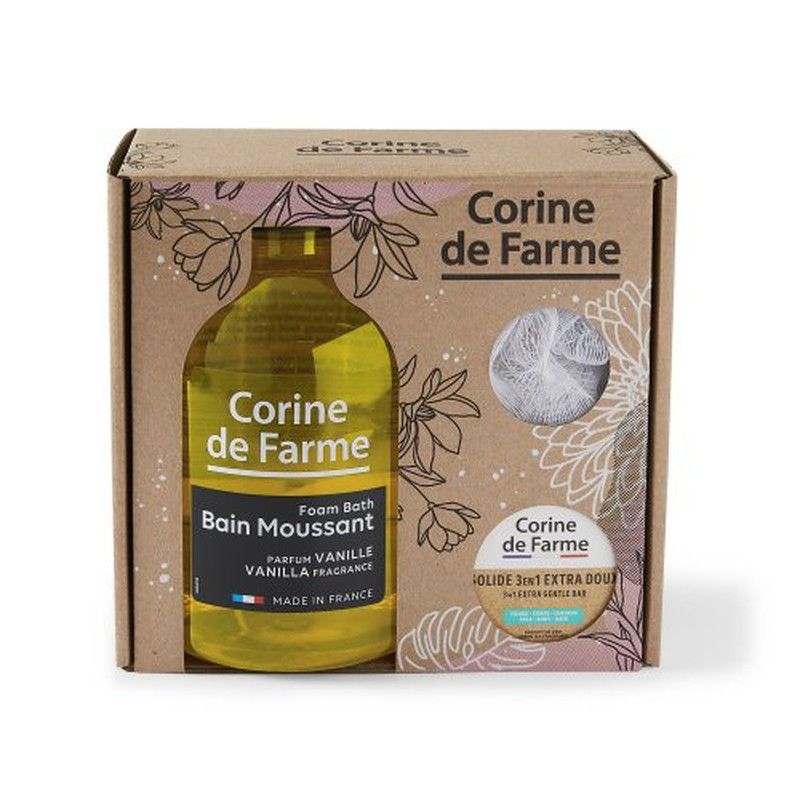 Pack de baño Corine de Farme con espuma de baño de vainilla de 1L y jabón sólido extra suave. Ideal para una experiencia relajante y perfumada. Producto francés de alta calidad, perfecto para el cuidado diario del cuerpo. Embalaje elegante con diseño floral, ideal como regalo.