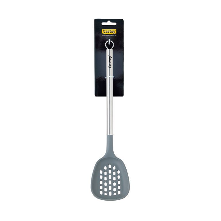 Espumadera de cocina Castey con mango de acero inoxidable y cabeza de silicona gris, ideal para escurrir alimentos en sartenes o woks. Resistente al calor y fácil de limpiar, perfecta para cocinar sin dañar los utensilios. Diseño funcional y moderno para uso diario en tu cocina.