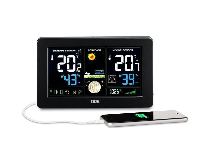 Estación meteorológica Ade con pantalla digital que muestra temperatura, humedad y pronóstico del tiempo tanto en interior como exterior. Incluye sensor remoto, indicador de presión atmosférica y puerto USB para cargar móviles. Ideal para hogares que desean monitorear el clima con precisión y comodidad. Diseño moderno y funcional en color negro.