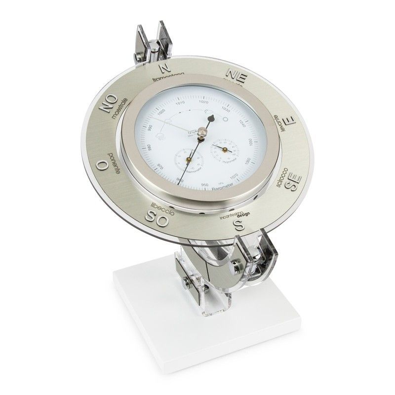 Estación meteorológica de mesa Cellarius 340 M.X de Incantesimo Design, con elegante diseño de brújula y reloj. Fabricada en acero inoxidable y vidrio, ideal para decorar espacios modernos con estilo náutico. Combina funcionalidad y diseño para amantes de la decoración sofisticada.