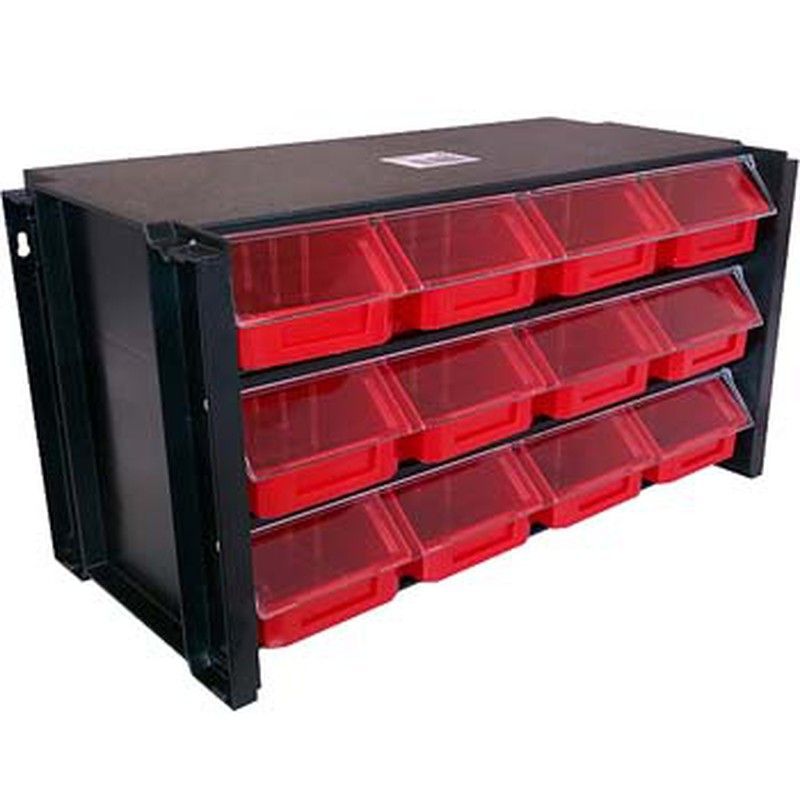 Estante clasificador apilable de 12 cajones Tayg, ideal para talleres, garajes o espacios de bricolaje. Fabricado en plástico resistente, con cajones rojos transparentes y estructura negra para una organización visual y eficiente. Perfecto para guardar herramientas, tornillos, piezas pequeñas y accesorios. Diseño modular y apilable para optimizar e