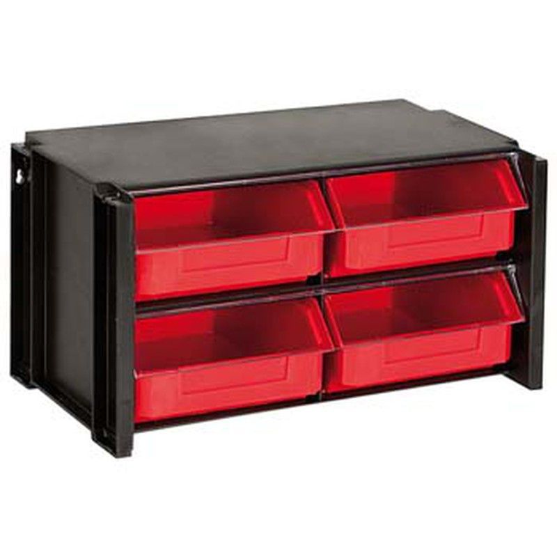 Estante clasificador apilable de 4 cajones Tayg, ideal para talleres, garajes o espacios de bricolaje. Fabricado en plástico resistente, con cajones rojos y estructura negra para una organización visual y eficiente. Perfecto para almacenar herramientas, tornillos, tuercas y accesorios pequeños. Fácil montaje en pared o estantería gracias a sus late