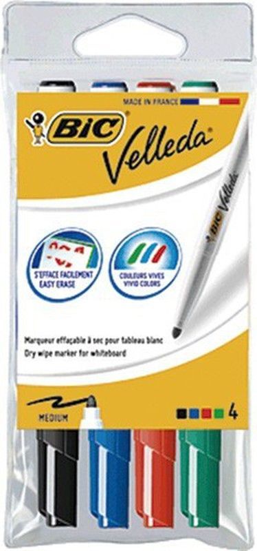 Estuche con 4 rotuladores Velleda de BIC, ideales para pizarras blancas. Con colores vivos (negro, azul, rojo y verde) y punta mediana, se borran fácilmente. Fabricados en Francia, son perfectos para uso en oficina, escuela o presentaciones. Incluyen tecnología de tinta seca para una escritura nítida y sin manchas.
