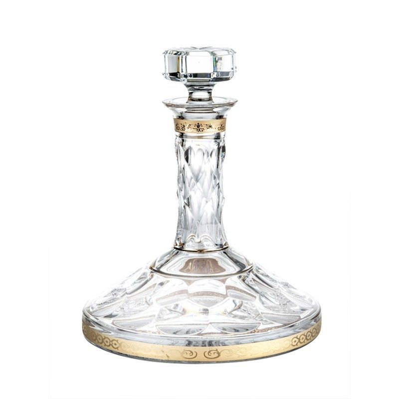 Elegante botella de cristal con detalles dorados, ideal para servir licores o bebidas especiales. Diseño tallado con base ancha y tapón de cristal, perfecta para decorar tu mesa o regalar en ocasiones especiales. Calidad premium y acabado sofisticado.