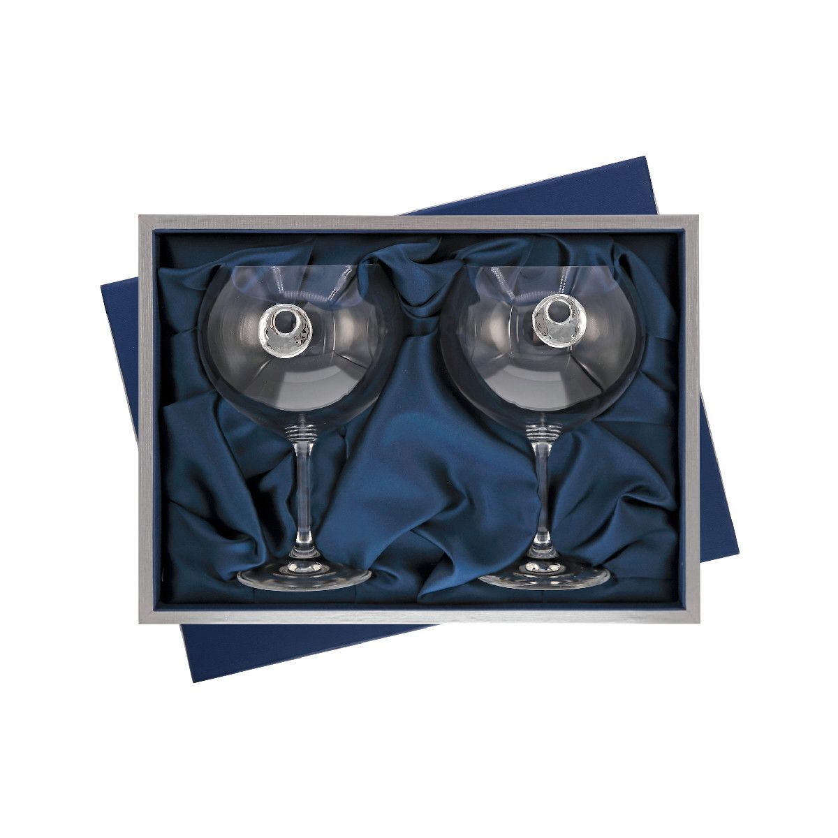 Elegante estuche con juego de dos copas de cristal para gin-tonic, capacidad 990ml cada una. Diseño sofisticado con base y tallo metálicos plateados, presentadas sobre tela de satén azul en caja rectangular. Ideal para regalar o disfrutar en casa con estilo.