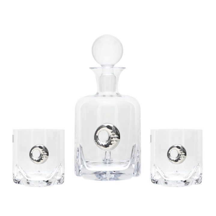 Elegante juego de cristalería GA4280 con botella de 1 litro y seis vasos de whisky, fabricado en cristal de alta calidad. Diseño sofisticado con detalles circulares metálicos y base facetada. Ideal para amantes del whisky o como regalo exclusivo para ocasiones especiales. Combina funcionalidad y estilo en cada pieza.
