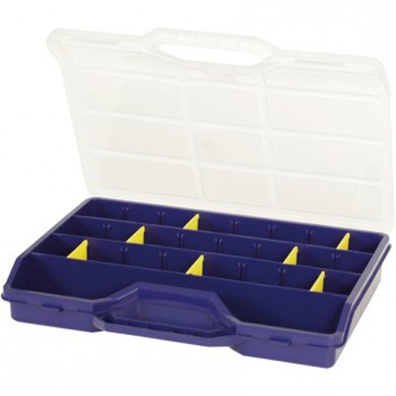 Estuche separador móvil de plástico ideal para organizar herramientas, accesorios o piezas pequeñas. Con tapa transparente y compartimentos internos con separadores amarillos, permite una clasificación ordenada y fácil acceso. Perfecto para bricolaje, taller o uso profesional. Diseño compacto y portátil con asas integradas.