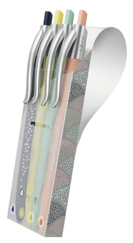 Estuche de 4 bolígrafos PL1 Silver con diseño moderno y elegante. Ideal para oficina o estudio, presenta cuerpos translúcidos con tapas de colores y detalles metálicos. El estuche con patrón geométrico de puntos en tonos grises y plateados ofrece un toque sofisticado. Perfecto para mantener tus bolígrafos organizados y a mano.