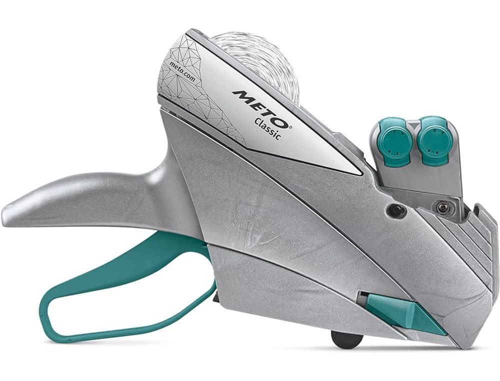 Etiquetadora METO Classic L 1932, ideal para tiendas, almacenes y oficinas. Diseño ergonómico en acabado plateado con detalles en verde, fácil de usar y resistente. Incluye dos rodillos para etiquetas de 32x19 mm con capacidad para 19 caracteres numéricos. Fabricada en metal y plástico de alta calidad para una durabilidad óptima. Perfecta para etiq