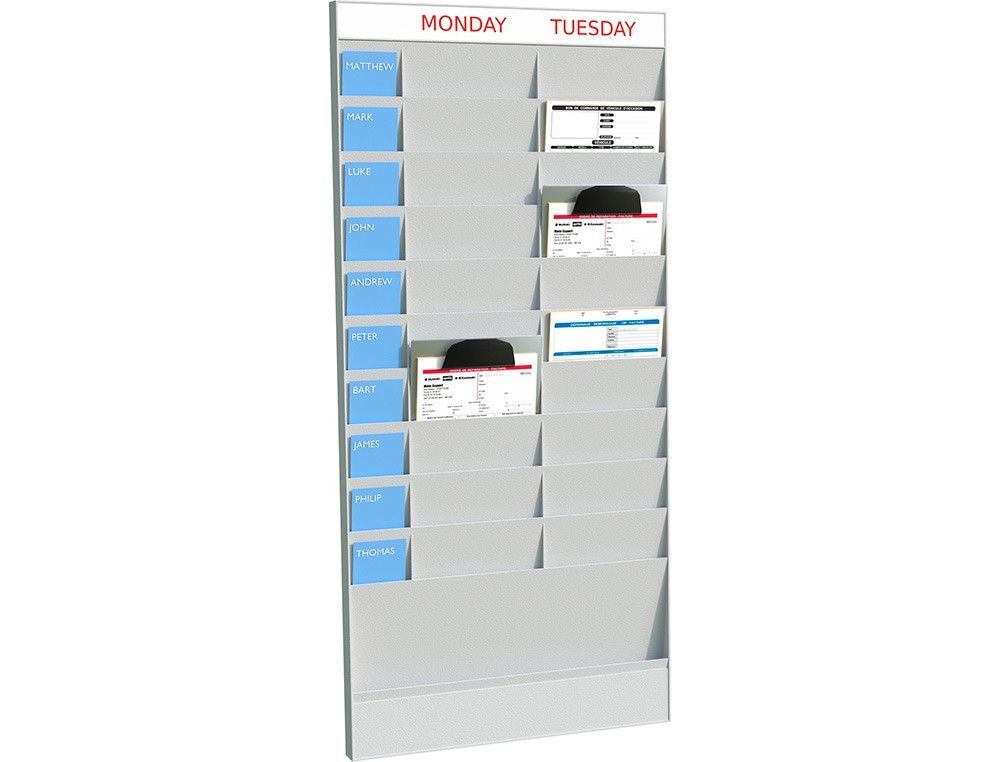 Expositor mural Paperflow con 20 casillas para documentos DIN A4, ideal para oficinas. Diseño modular en color gris con detalles azules y etiquetas de días de la semana. Organiza documentos diarios de forma eficiente y visual. Perfecto para despachos, administraciones y centros de trabajo que necesitan orden y accesibilidad.