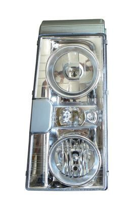 Faro delantero izquierdo con diseño rectangular y dos faros circulares superpuestosLente transparente con acabado brillanteEstructura metálica con bordes cromadosDiseño funcional para vehículos pesados