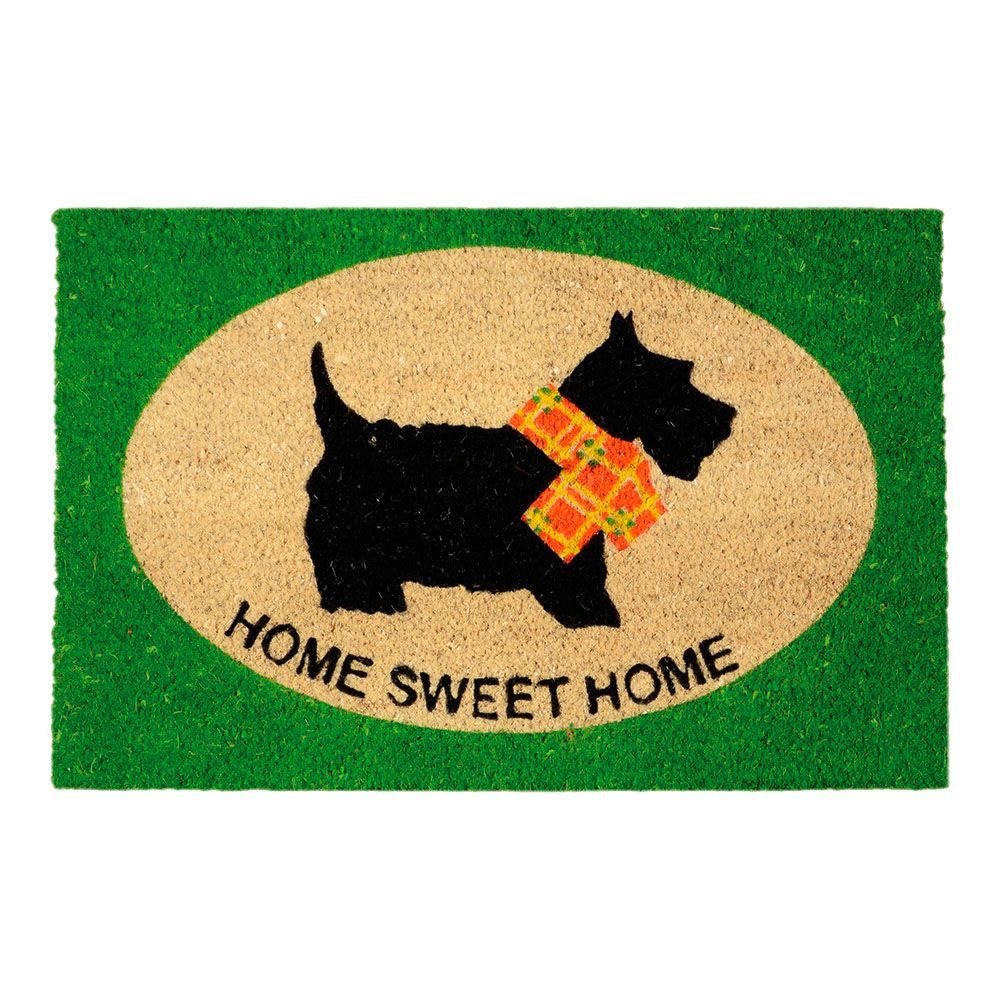 Felpudo de bienvenida de 60x40 cm con diseño de perro Scottie en silueta negra y pañuelo escocés naranja, sobre fondo beige ovalado y borde verde. Ideal para decorar la entrada de tu hogar con estilo y calidez. Fabricado en fibra natural resistente, perfecto para uso diario y fácil de limpiar. ¡Home sweet home!
