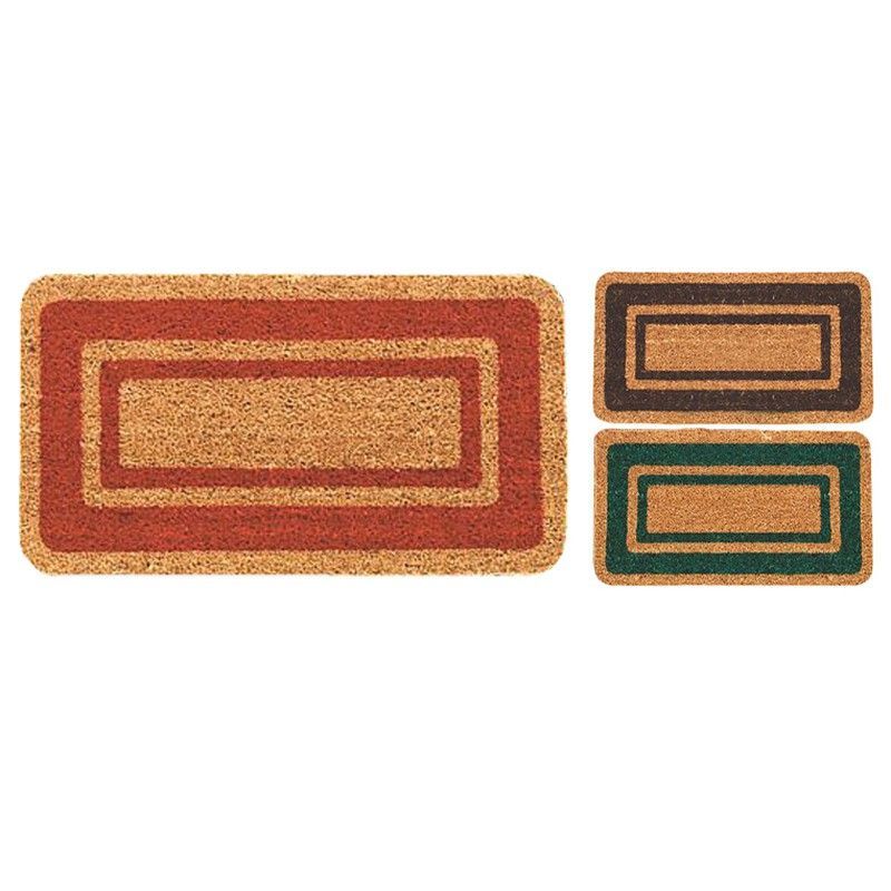 Felpudo de coco Asturias de 33x60 cm, ideal para entrada de casa o jardín. Diseño geométrico con marcos en rojo, verde y negro sobre fondo natural. Hecho de fibra de coco resistente y duradera, perfecto para mantener la entrada limpia. Pack surtido con tres tamaños para mayor versatilidad. Ideal para uso diario en exteriores o interiores.