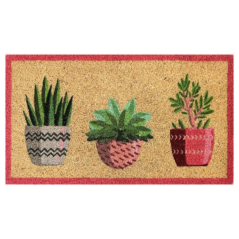Felpudo de coco con diseño de macetas y plantas suculentas, ideal para decorar entradas o espacios interiores. Con borde rojo y detalles en tonos verdes, grises y rosas, aporta un toque natural y moderno. Resistente y antideslizante, perfecto para uso diario en casa o jardín.