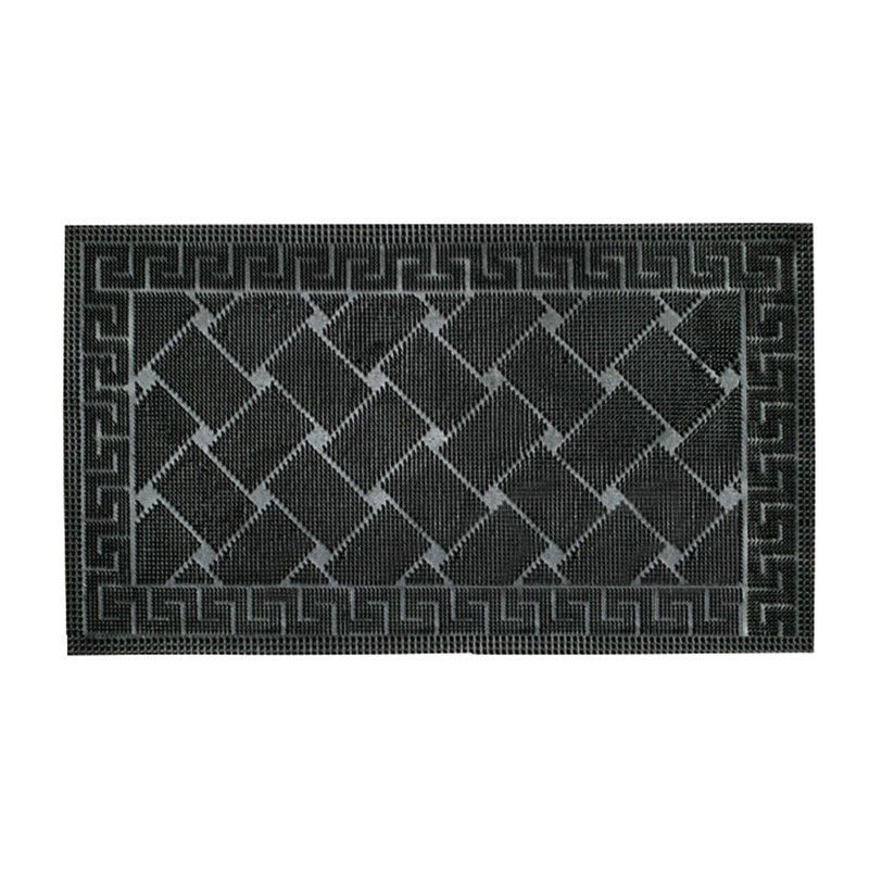 Felpudo de goma rectangular 40x70 cm con diseño geométrico elegante en tonos negro y gris. Ideal para entrada de casa o jardín, ofrece durabilidad y buen agarre. Su patrón de rombos entrelazados y borde griego aporta estilo clásico. Fácil de limpiar y resistente al agua.