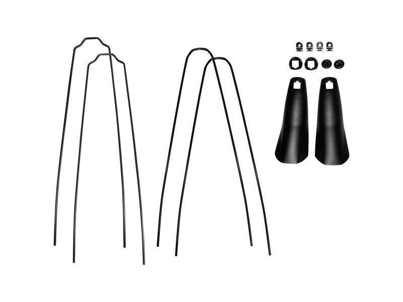 Kit de guardabarros Eurofender Snello Tempokit para bicicleta, en color negro. Incluye soportes metálicos, tapones de plástico y piezas de montaje. Diseñado para proteger de la lluvia y el barro durante el ciclismo. Ideal para ciclistas que buscan una solución práctica y duradera. Fácil instalación y compatibilidad con diversos modelos de bicicleta