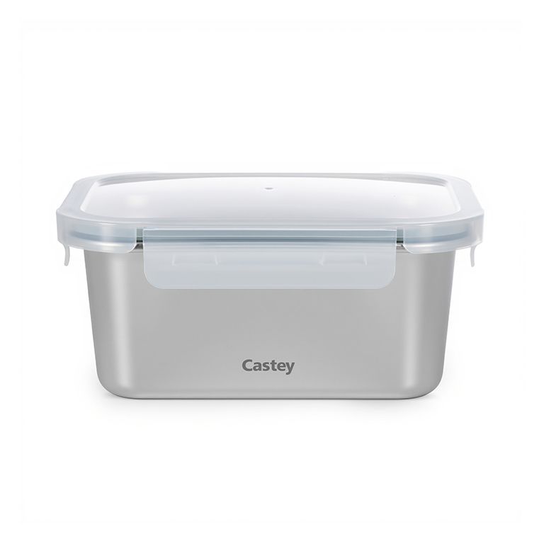 Fiambrera rectangular de acero inoxidable de 1600 ml, ideal para llevar comida al trabajo o al colegio. Con tapa de plástico transparente y cierre hermético, es apta para microondas y lavavajillas. Diseño elegante y funcional, con acabado mate y logotipo Castey. Perfecta para mantener tus alimentos frescos y organizados.