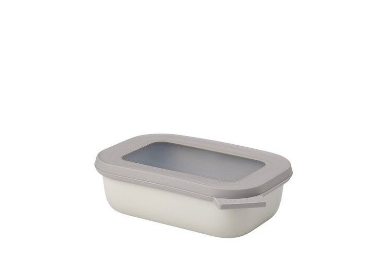 Fiambrera rectangular de 500 ml en color blanco nórdico con tapa gris, ideal para llevar comidas al trabajo o escuela. Fabricada en plástico resistente y con cierre hermético para mantener los alimentos frescos. Incluye ventana transparente en la tapa para ver el contenido sin abrir. Diseño moderno y práctico, fácil de limpiar y apilable.