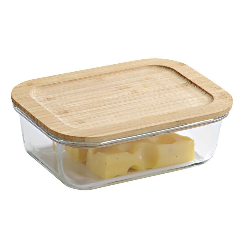 Fiambrera rectangular de 80 cl con tapa de bambú, ideal para llevar alimentos al trabajo o al colegio. Fabricada en vidrio resistente al horno y con tapa de madera natural, combina funcionalidad y estilo. Perfecta para conservar quesos, ensaladas o bocadillos con frescura. Fácil de limpiar y apta para microondas y lavavajillas.