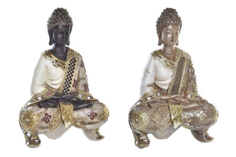 Figura decorativa de Buda en resina, con acabado dorado y detalles en blanco y negro. Ideal para decorar espacios de meditación, salas o escritorios. Diseño elegante y detallado, con vestimenta estampada y acabados metálicos. Perfecta para amantes de la decoración oriental y la armonía interior.