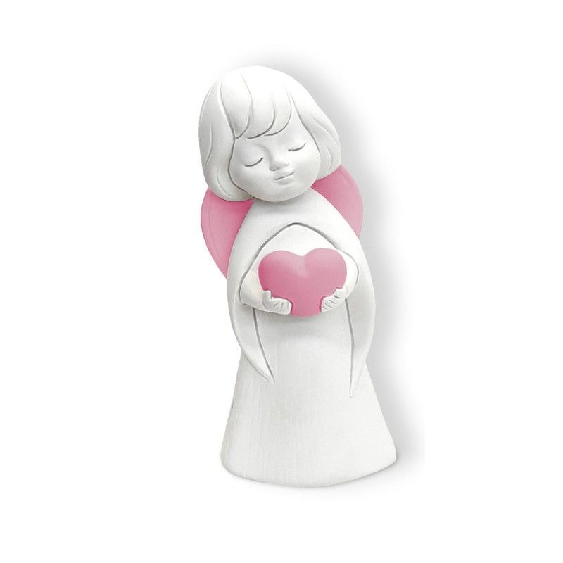 Figura decorativa de ángel de 10 cm con corazón rosa, ideal para decorar el hogar con un toque de ternura y calidez. Hecha en resina de alta calidad, esta escultura blanca con detalles rosados transmite paz y amor. Perfecta para regalar o como adorno en estanterías, mesitas de noche o espacios de meditación.