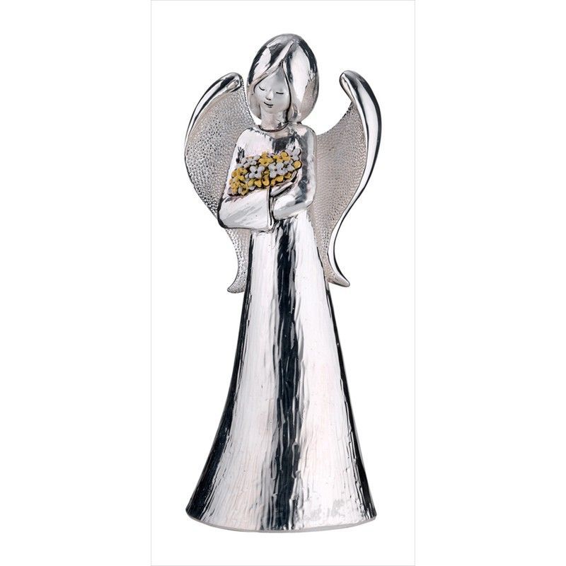 Figura decorativa de ángel de 22 cm, ideal para adornar tu hogar con elegancia y simbolismo. Hecha en metal con acabado plateado brillante, presenta alas detalladas y un ramo de flores doradas y blancas. Perfecta para espacios de meditación, mesas de centro o como regalo con significado. Aporta un toque de paz y abundancia a tu decoración.