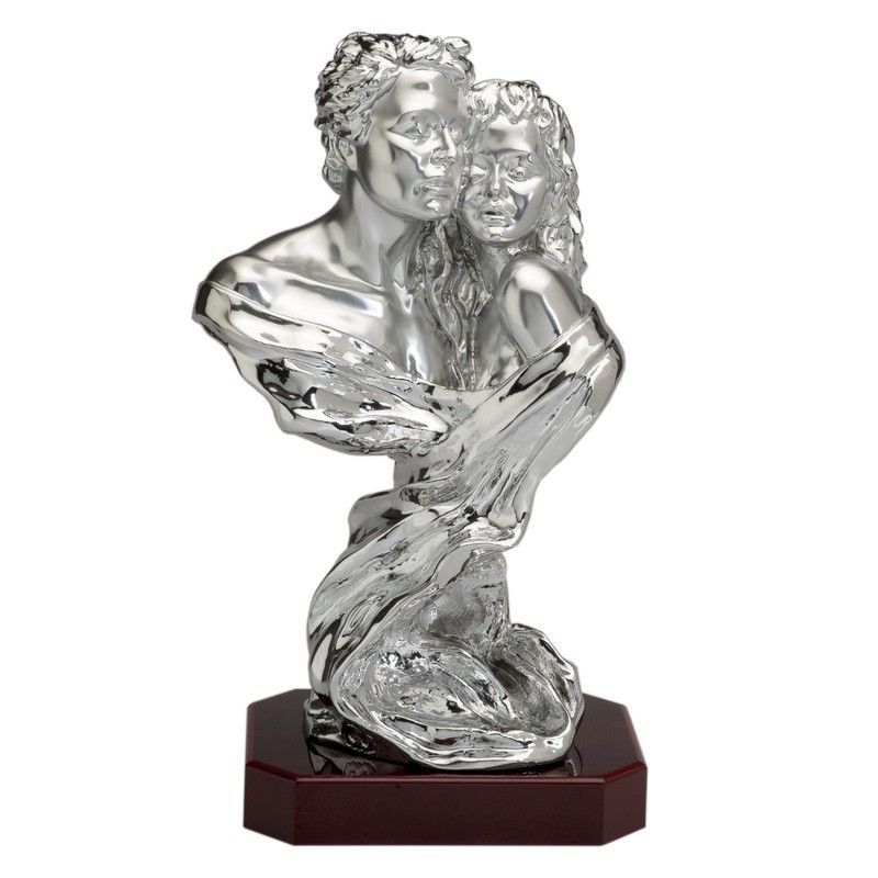 Figura decorativa de pareja abrazada en acabado plateado, ideal para adornar estanterías, mesas o escritorios. Hecha en metal con base de madera, aporta elegancia y romanticismo a cualquier espacio. Perfecta como regalo para aniversarios o bodas.