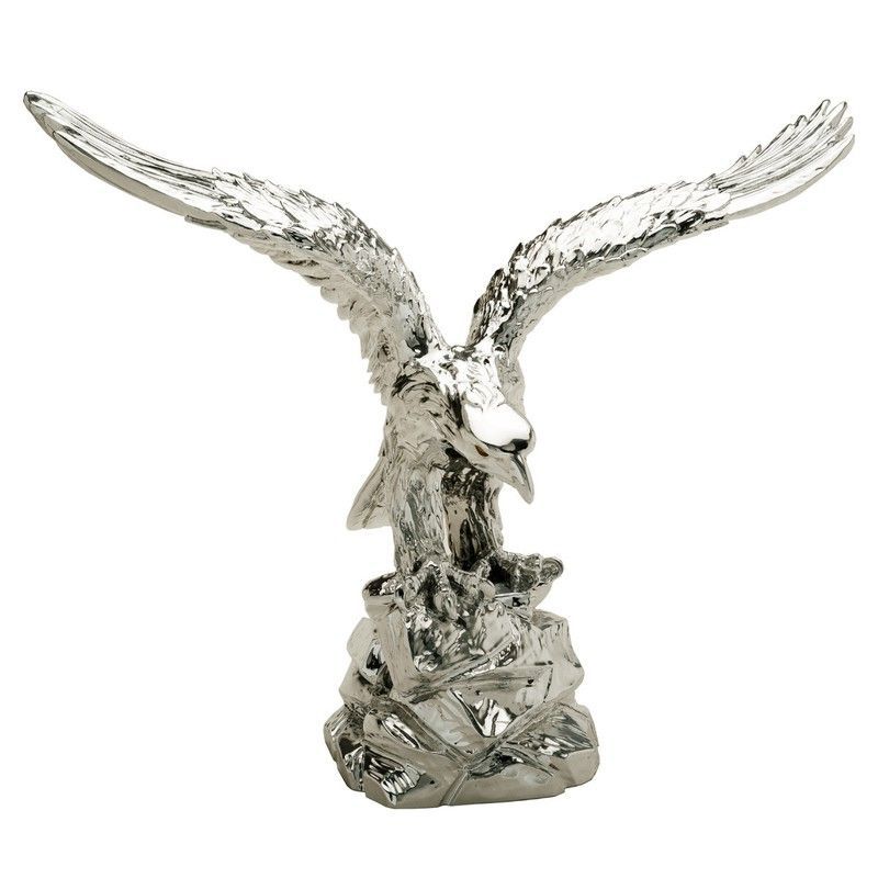 Figura decorativa de águila en metal con acabado plateado, ideal para decorar espacios elegantes. Con alas abiertas y detalles realistas en plumaje y pico, esta escultura de 39x35 cm aporta un toque majestuoso a cualquier hogar o oficina. Perfecta como pieza central en estanterías, mesas o escritorios.