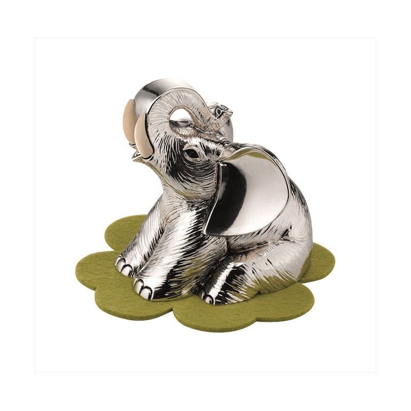 Figura decorativa de elefante en metal plateado, con acabado brillante y detalles realistas en la piel. Ideal para decorar estanterías, mesas o escritorios. Incluye base de diseño de hoja verde. Un toque elegante y sofisticado para tu hogar o oficina.