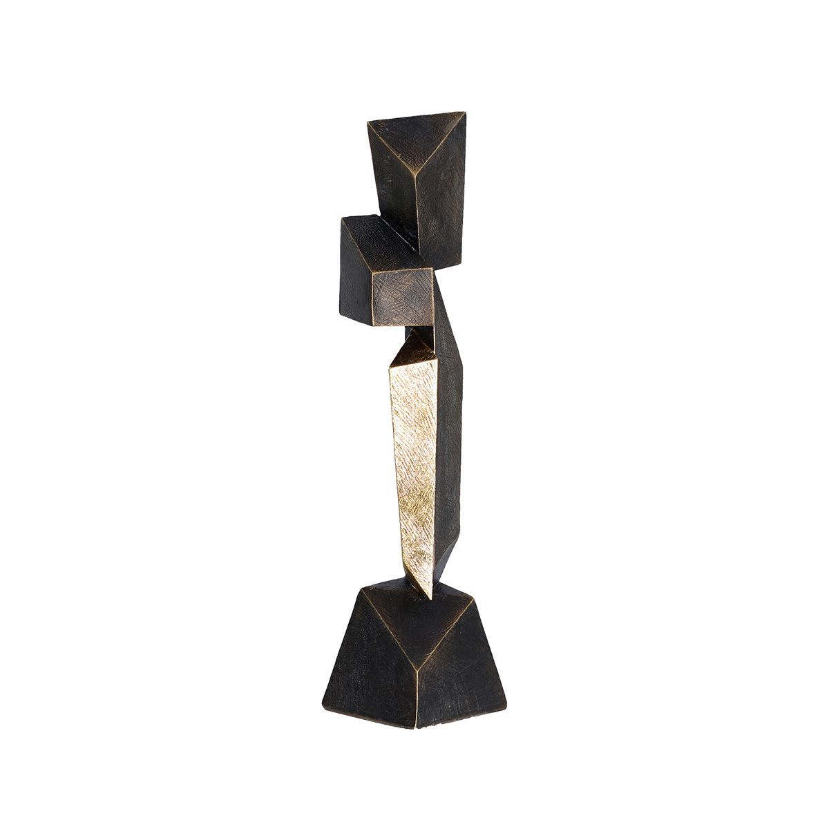 Figura decorativa de poliresina en negro y dorado, ideal para embellecer espacios modernos. Con diseño geométrico abstracto y acabado sofisticado, aporta elegancia a salones, oficinas o estanterías. Medidas: 11 x 10 x 46 cm. Perfecta como pieza de arte contemporáneo.