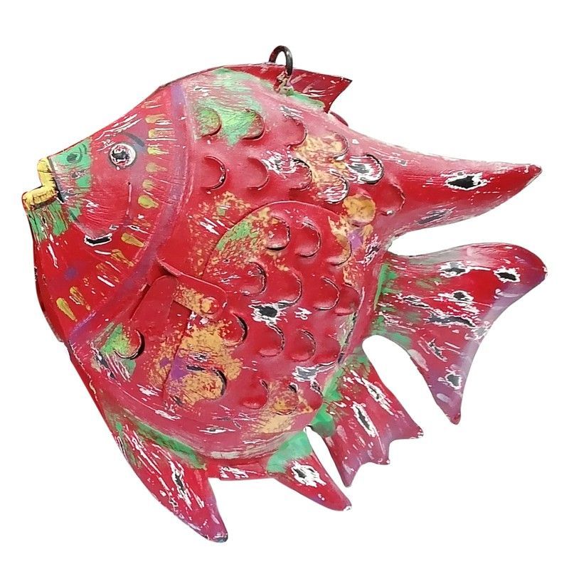 Figura decorativa de pez rojo en metal, ideal para adornar tu hogar o jardín. Con detalles en verde y dorado, escamas perforadas y acabado artesanal, esta pieza aporta un toque colorido y exótico. Incluye anilla para colgar fácilmente. Perfecta como portavelas o adorno decorativo en estilos boho, tropical o étnico.