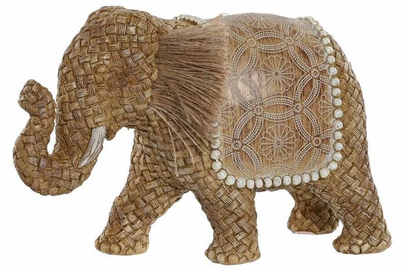 Figura decorativa de elefante en resina con acabado natural y textura trenzada, ideal para decorar estanterías, mesas o rincones de tu hogar. Con detalles geométricos en la espalda y borde de perlas blancas, aporta un toque exótico y sofisticado. Perfecta para amantes de la decoración boho, étnica o natural. Medidas: 23x9,5x15,5 cm.