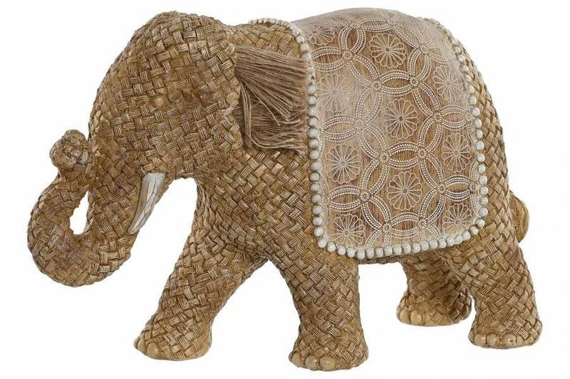 Figura decorativa de elefante en resina con acabado trenzado natural, ideal para decorar estanterías, mesas o rincones del hogar. Con detalles en tela beige con patrón geométrico y borde de perlas blancas, aporta un toque exótico y elegante. Perfecta para amantes de la decoración boho, étnica o natural.